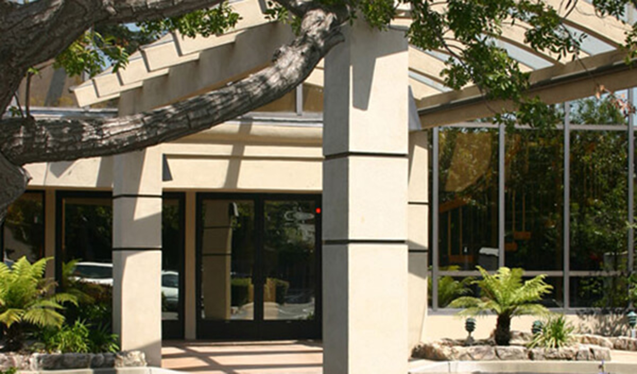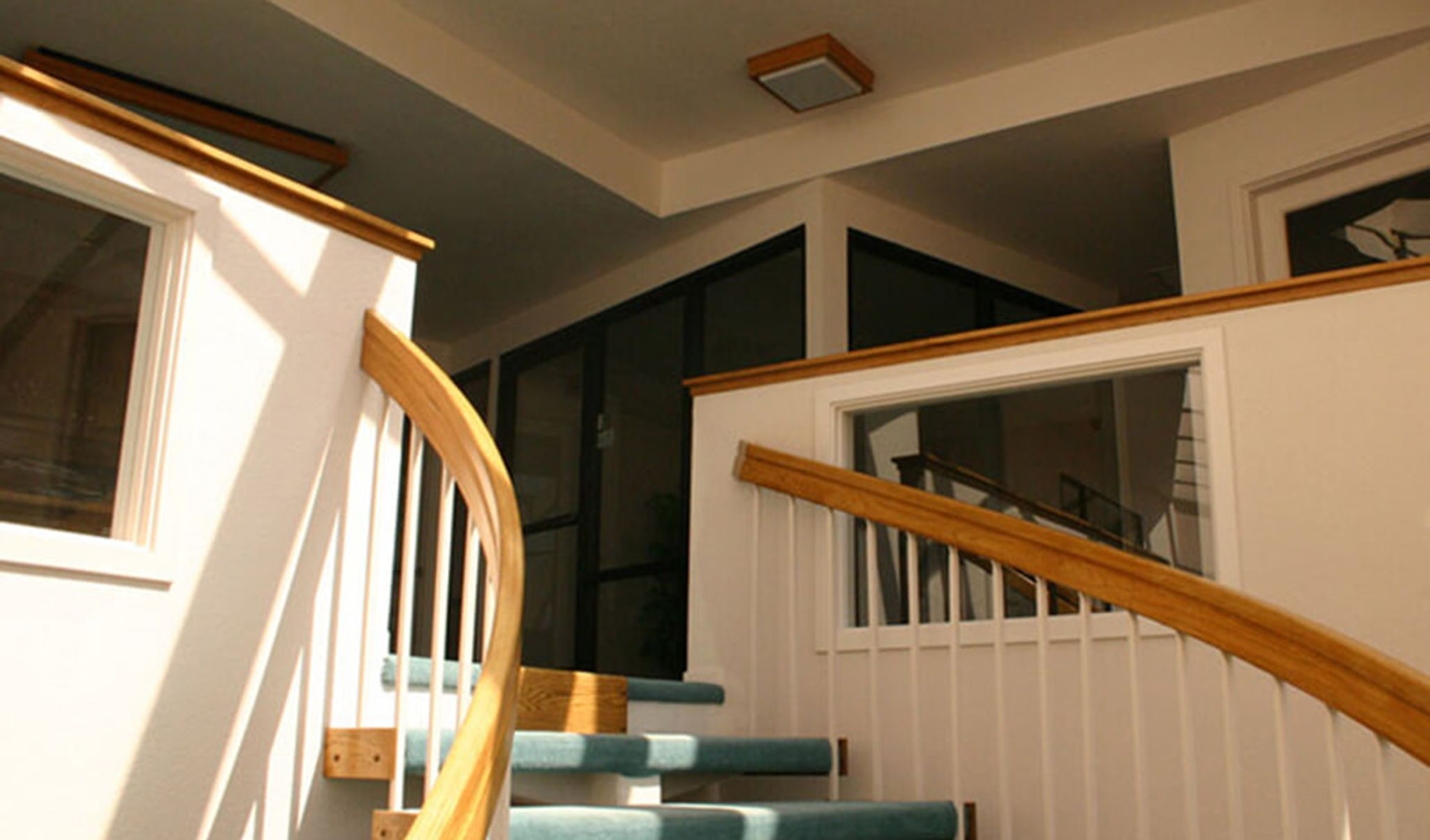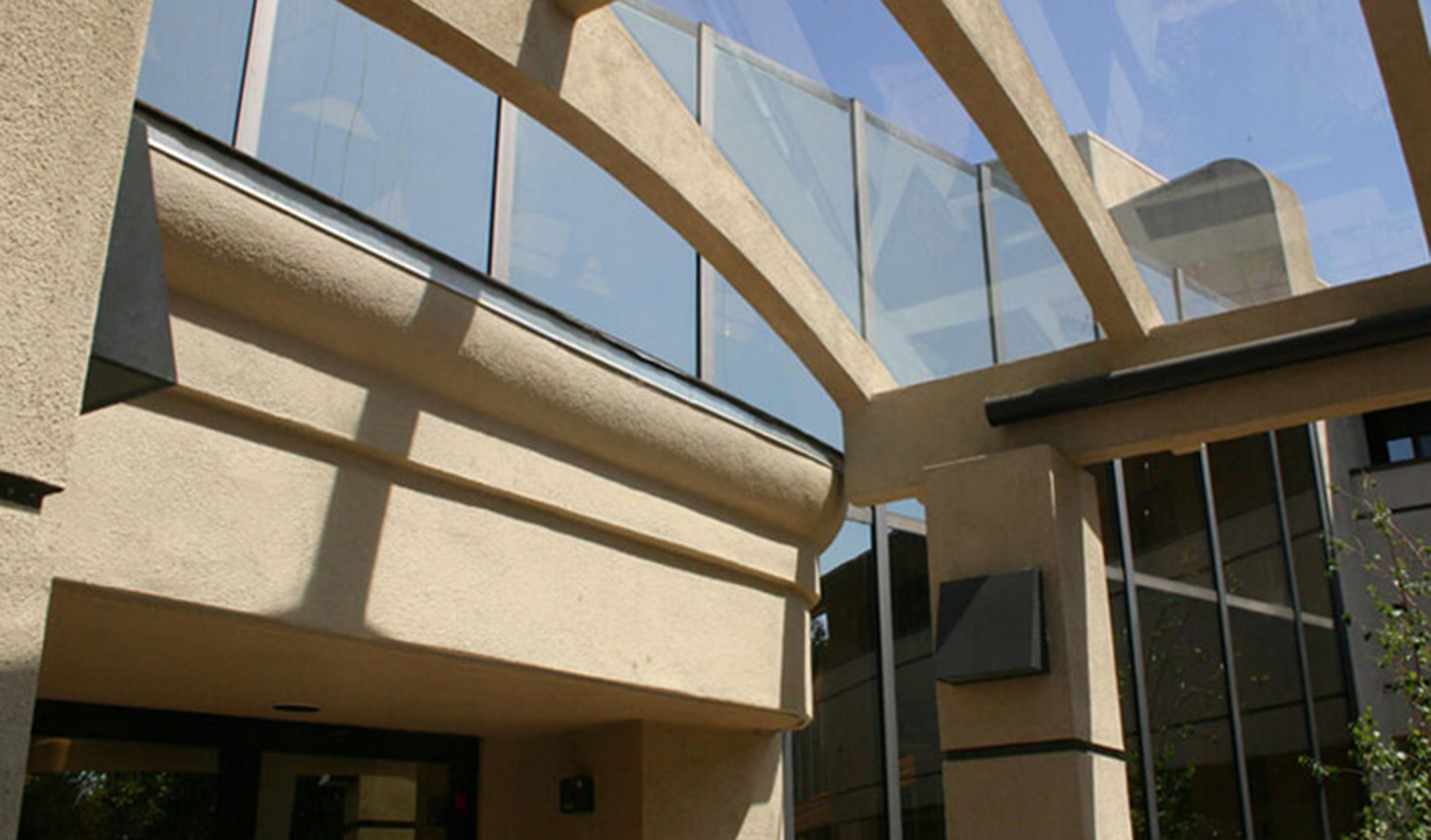 The spiral staircase is protected by a series of arched glue-lam beams and glass and the entry is protected with a glazed porte-cochere as well.