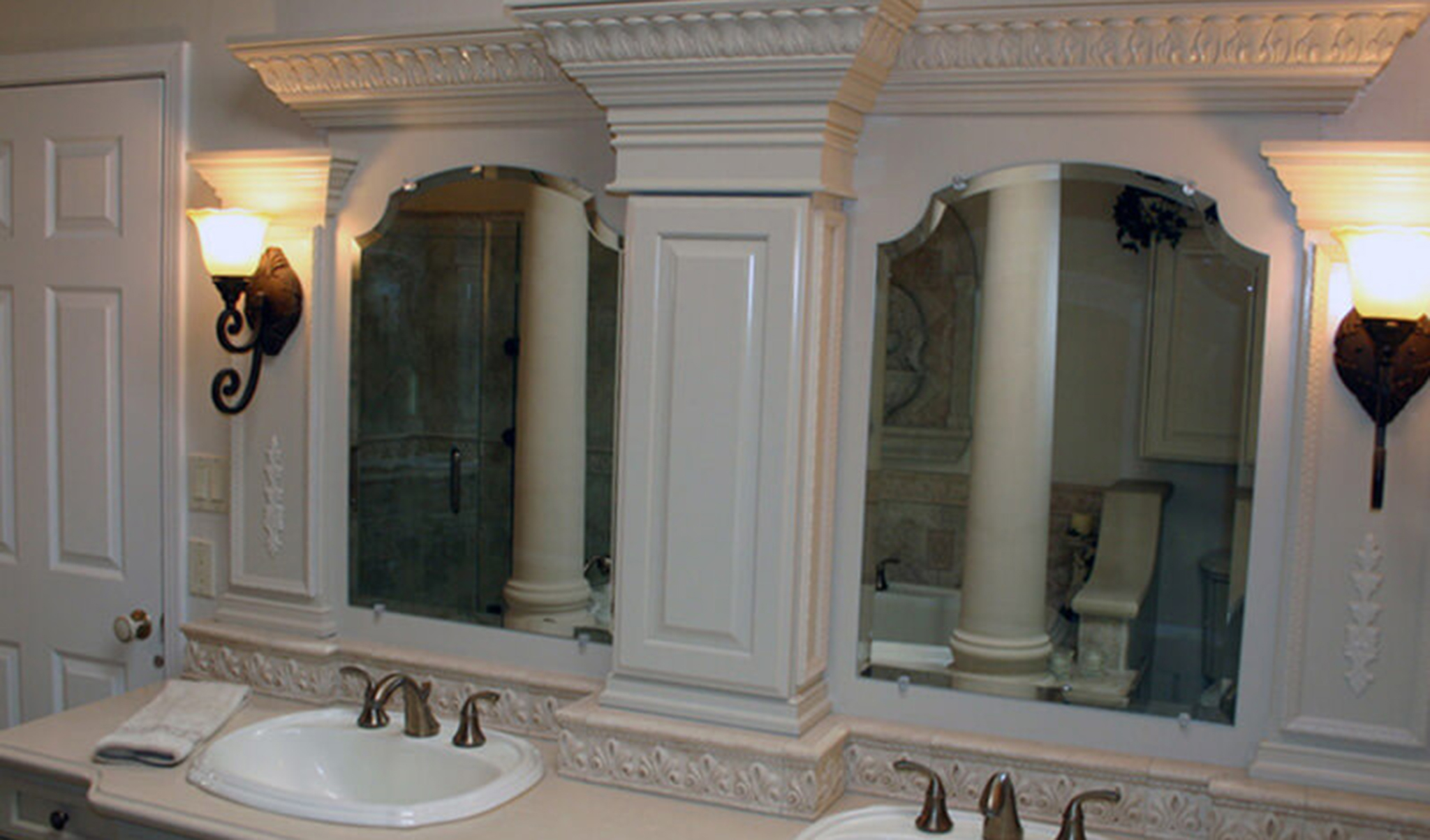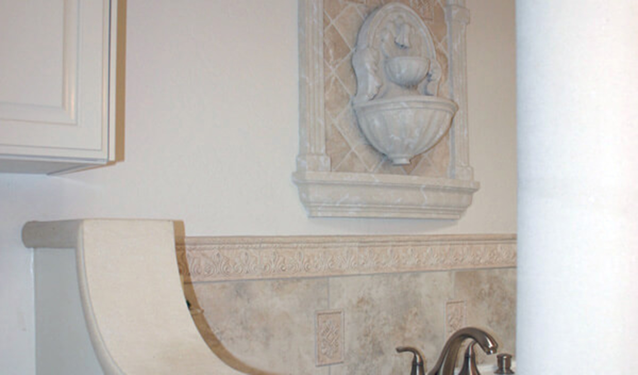 The medicine cabinet is located between the two beveled mirrors and opposite the Kohler Jacuzzi centered between two 8” tapered ionic limestone columns setting above the built-up tub porcelain tile platform.