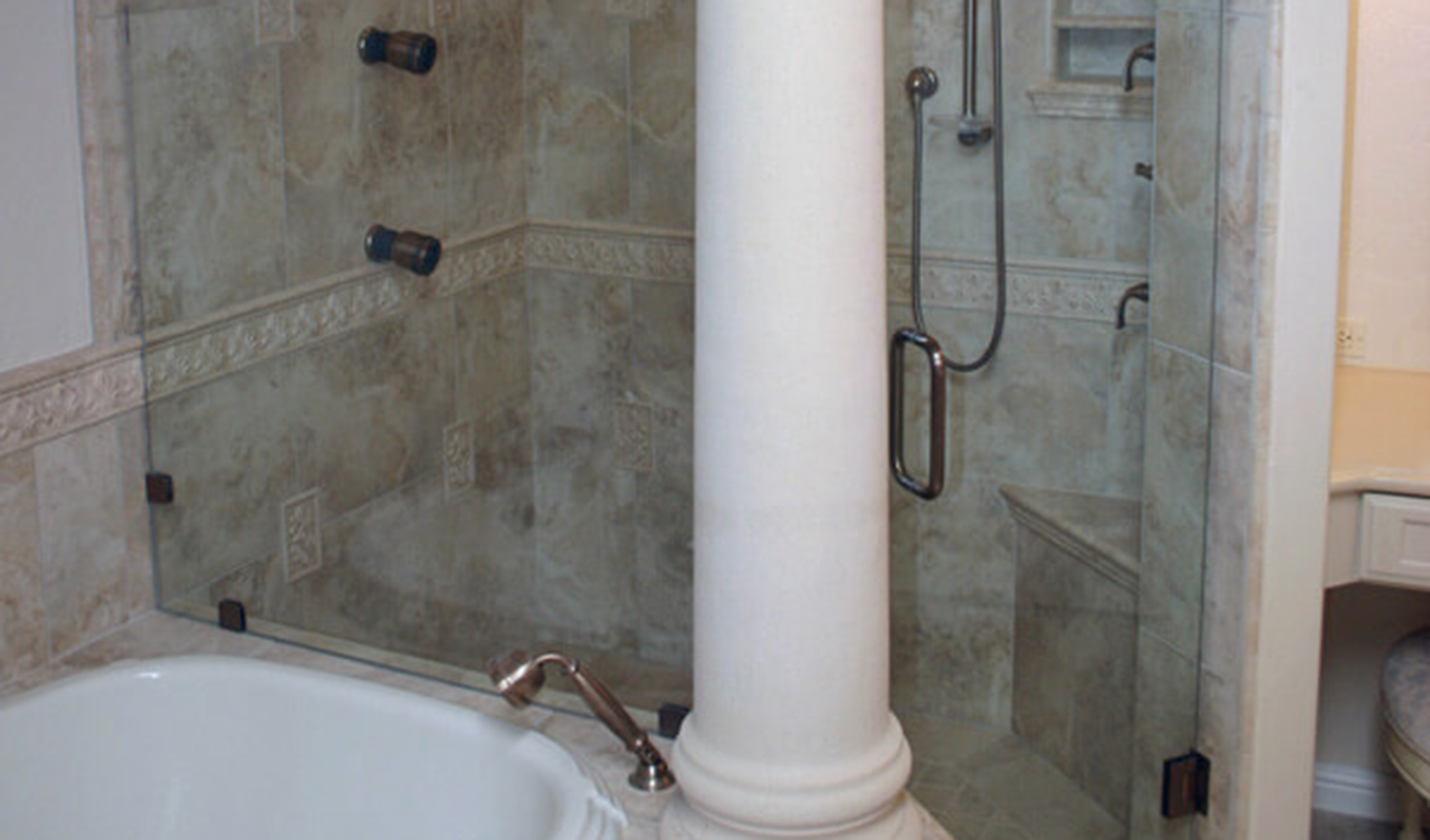 The ceiling is vaulted with an arched soffit between columns and soffit ceilings above the shower to keep the heat in, creating shelves for decor and more interest in the overall volume of the space.