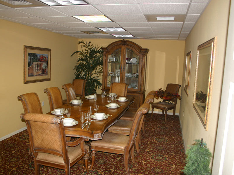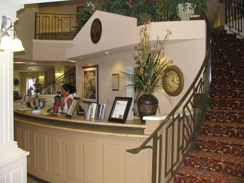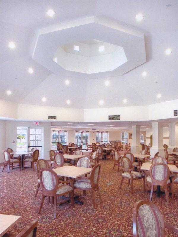Outside the facility you will discover beautifully landscaped walks and grounds and putting greens. The dining room is oriented to enjoy the private grounds and ponds as well as the community activities, offered along the street frontage, with an inviting covered entry area.