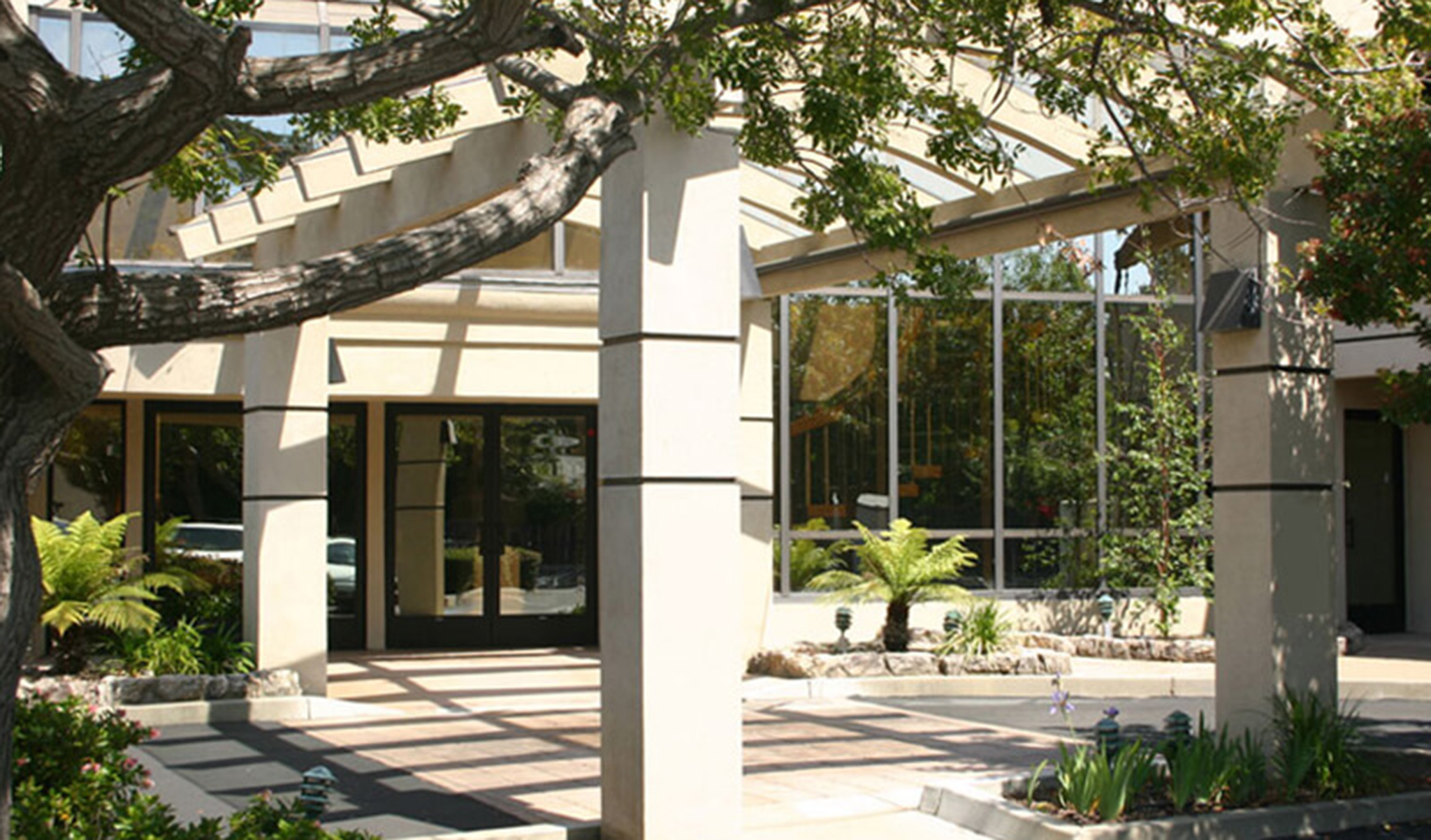 The spiral staircase is protected by a series of arched glue-lam beams and glass and the entry is protected with a glazed porte-cochere as well.