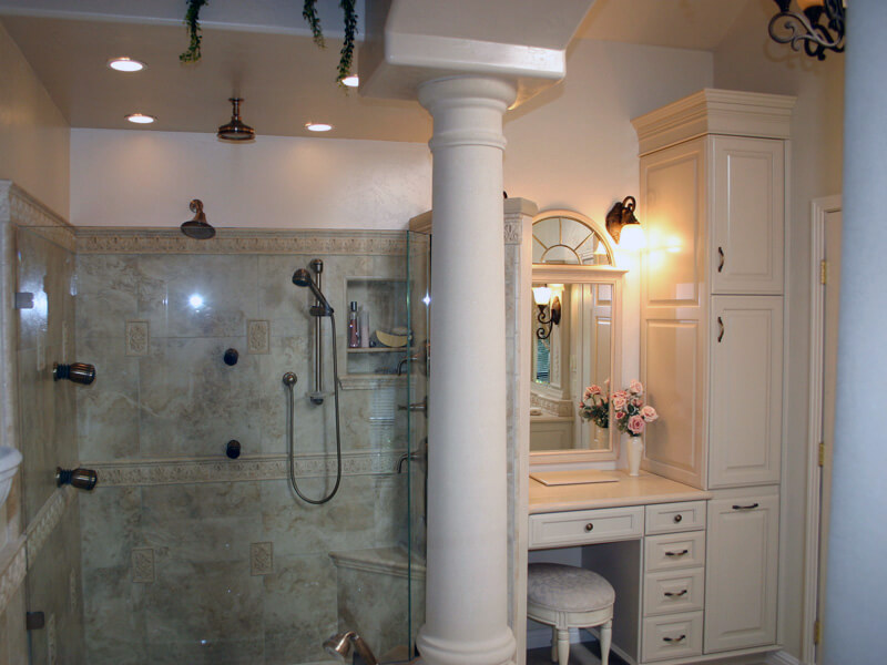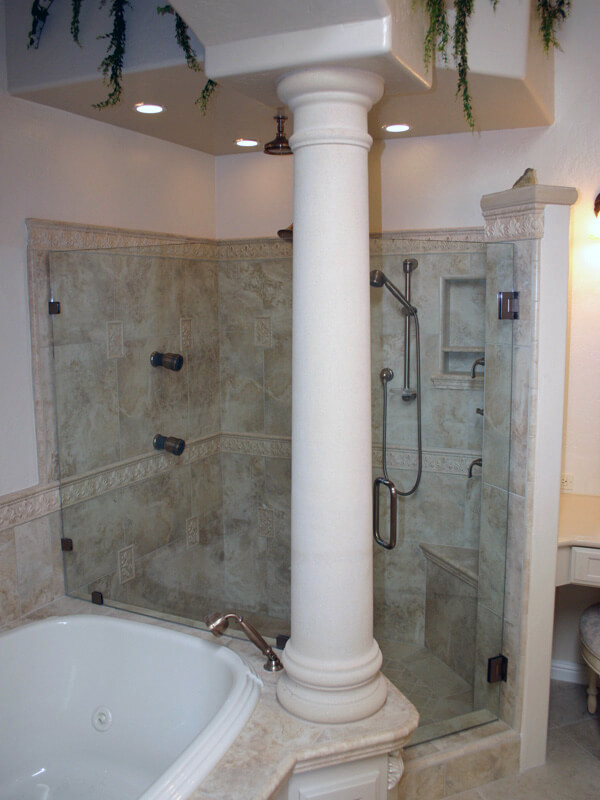The ceiling is vaulted with an arched soffit between columns and soffit ceilings above the shower to keep the heat in, creating shelves for decor and more interest in the overall volume of the space.