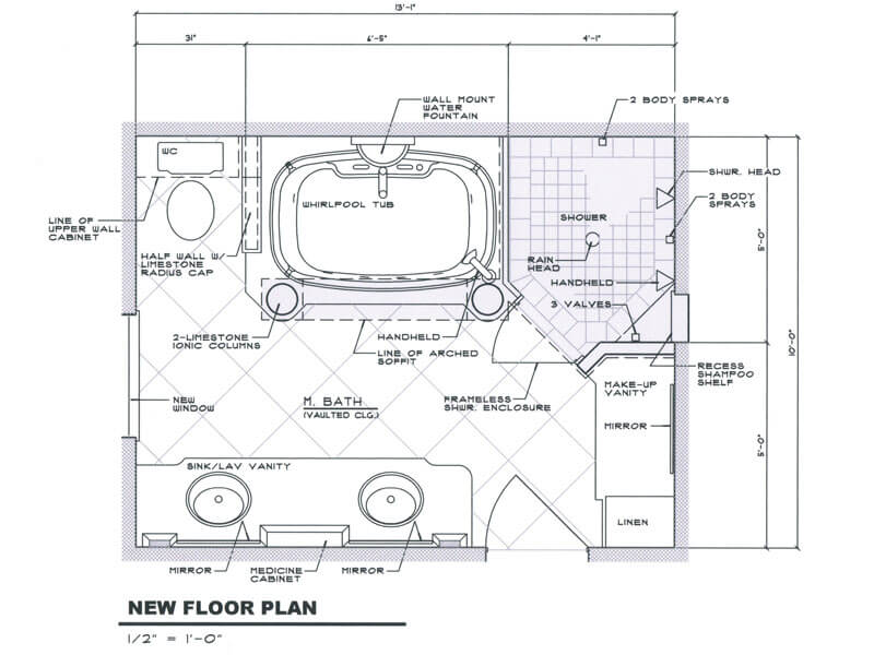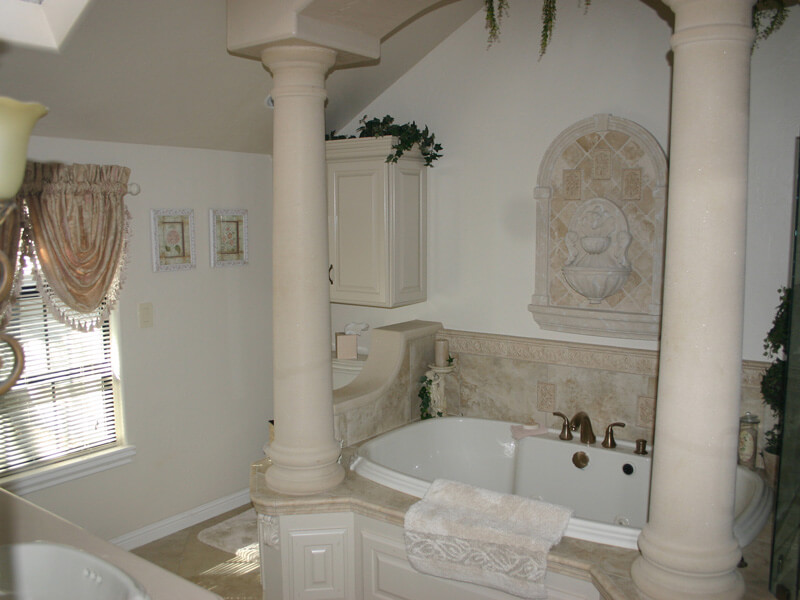 The medicine cabinet is located between the two beveled mirrors and opposite the Kohler Jacuzzi centered between two 8” tapered ionic limestone columns setting above the built-up tub porcelain tile platform.