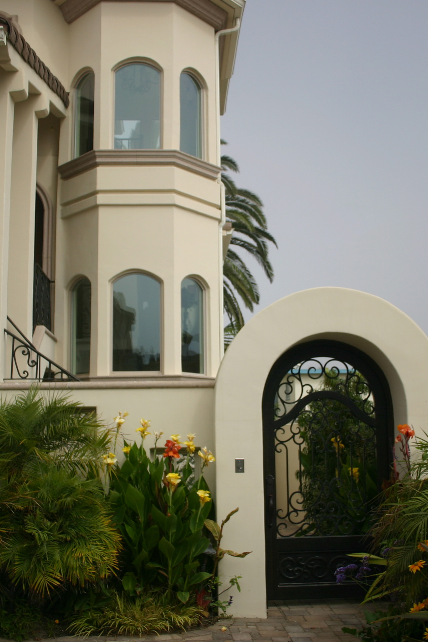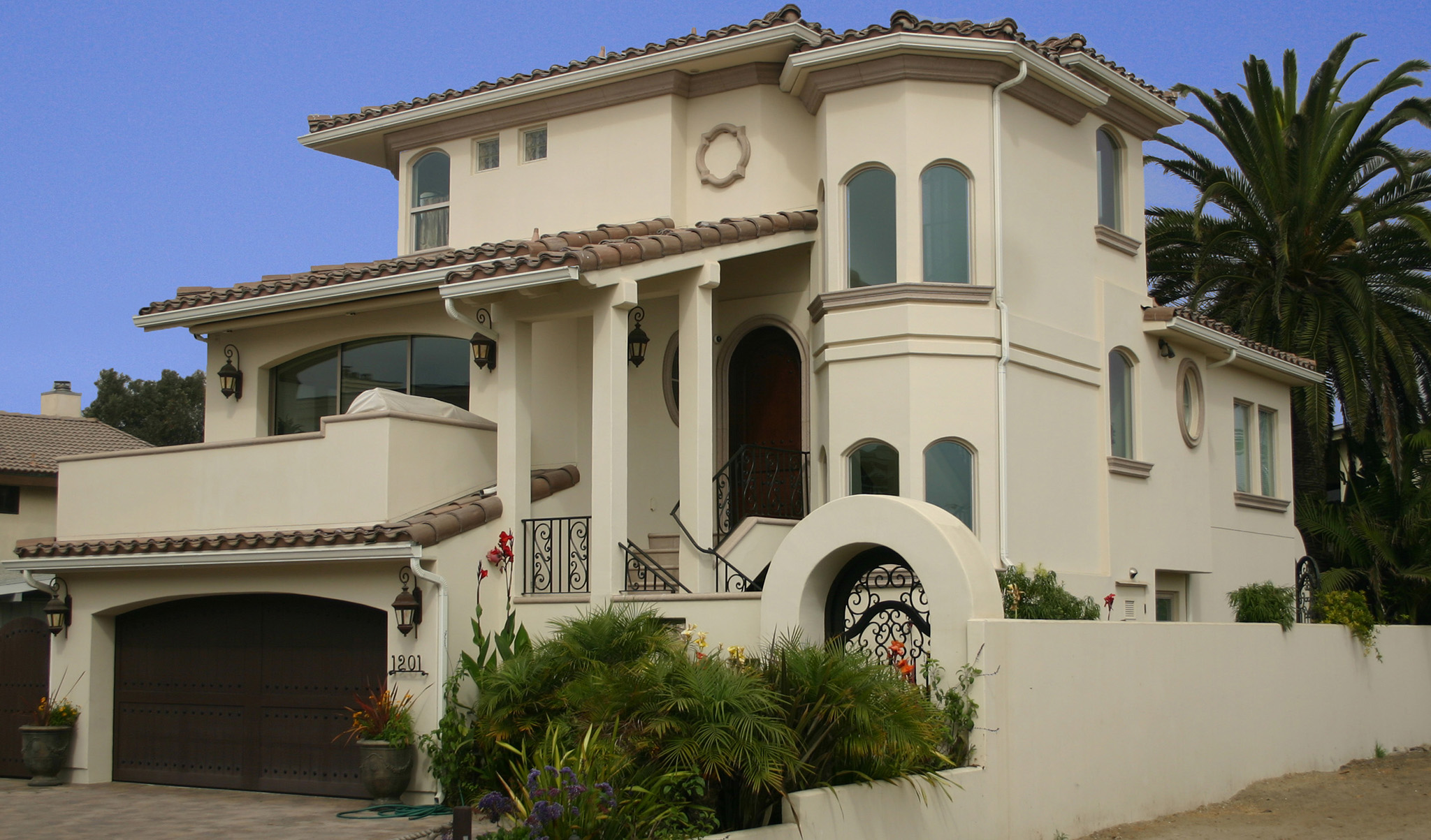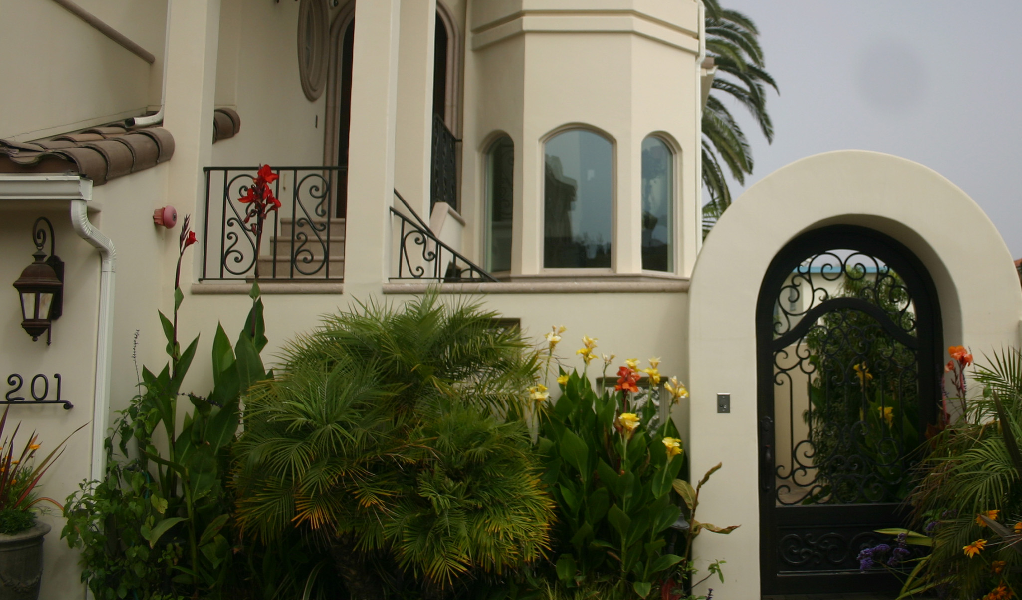 The front yard consists of additional parking for guests, and a private courtyard beyond separated by a beautifully handcrafted wrought iron gate.